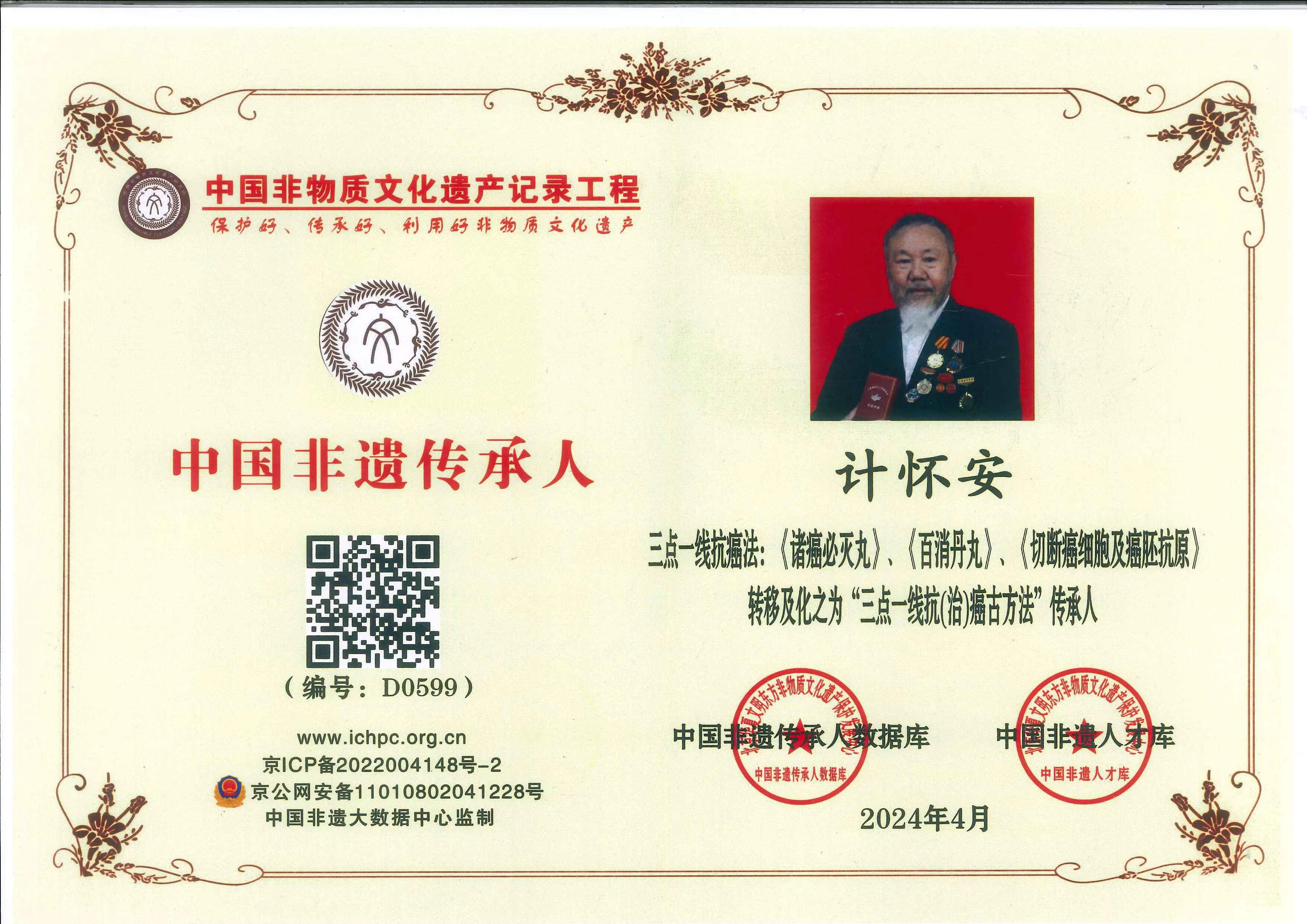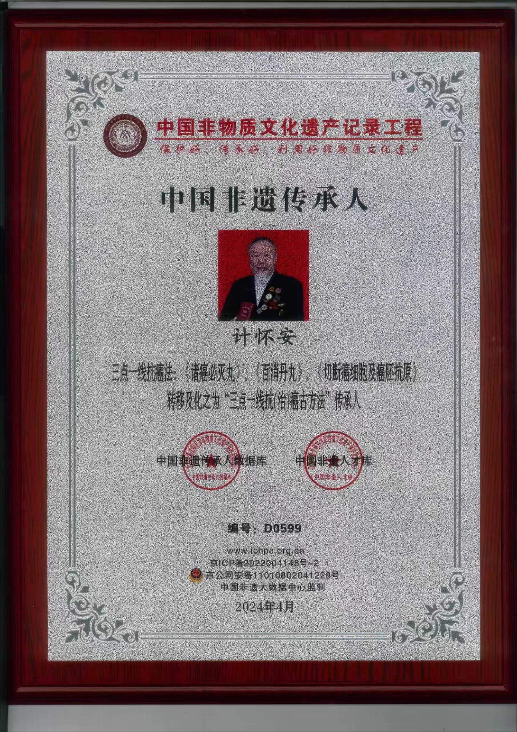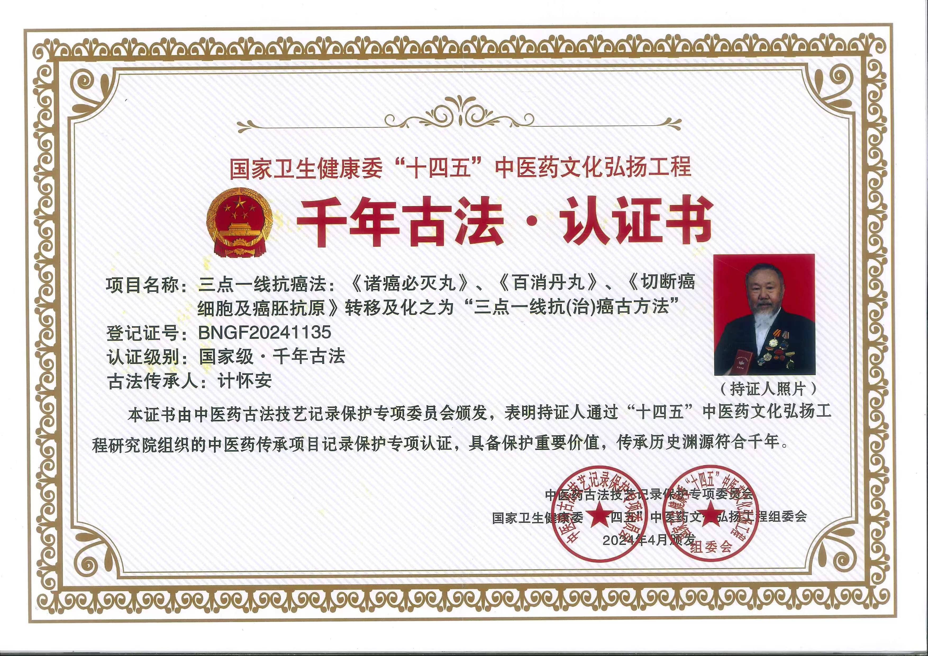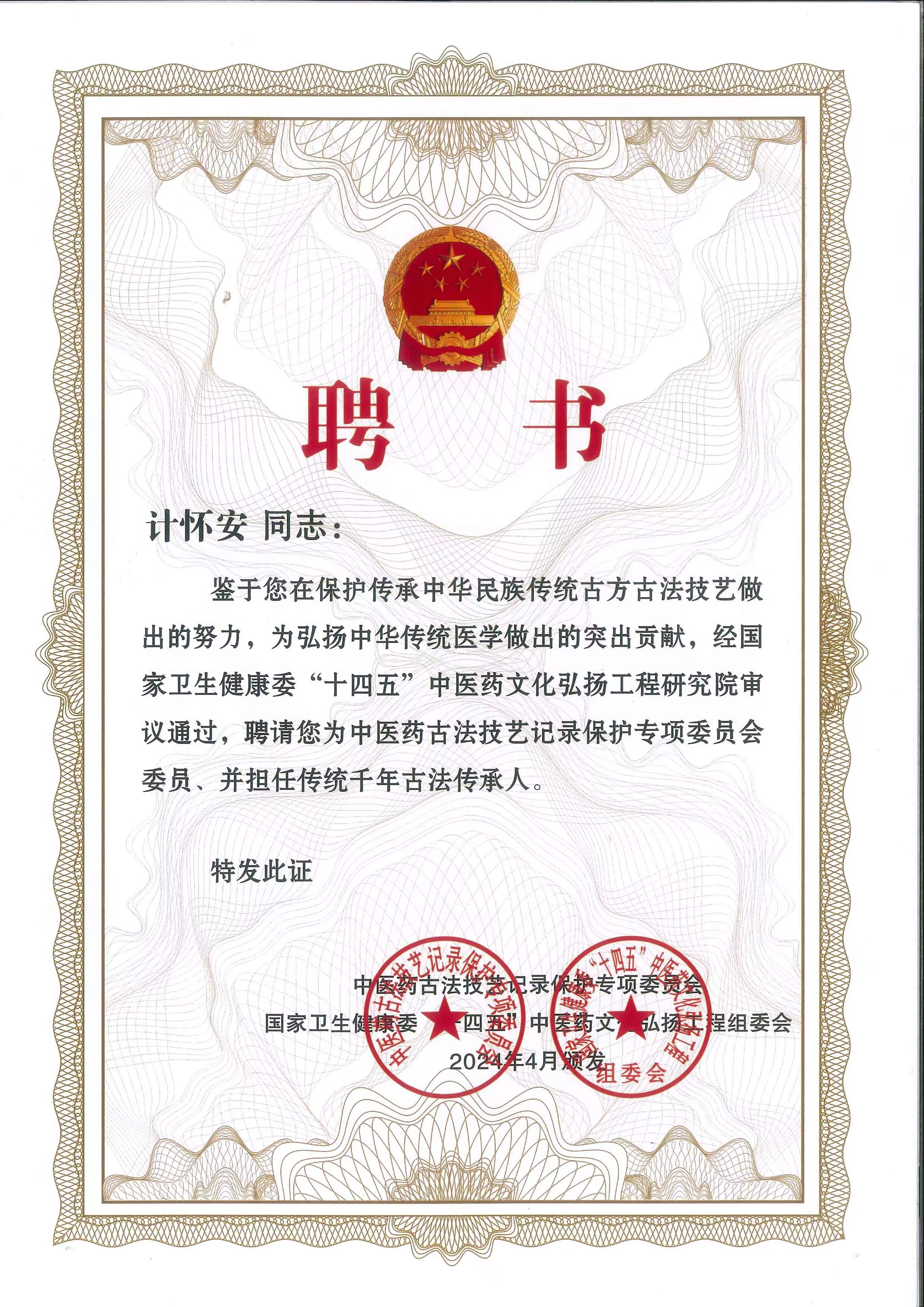 2024.5月荣获国卫健委中医千年古法十四五中医药文化弘扬工程研究院审议通过,聘请为中医古法技艺记录保护传承人;