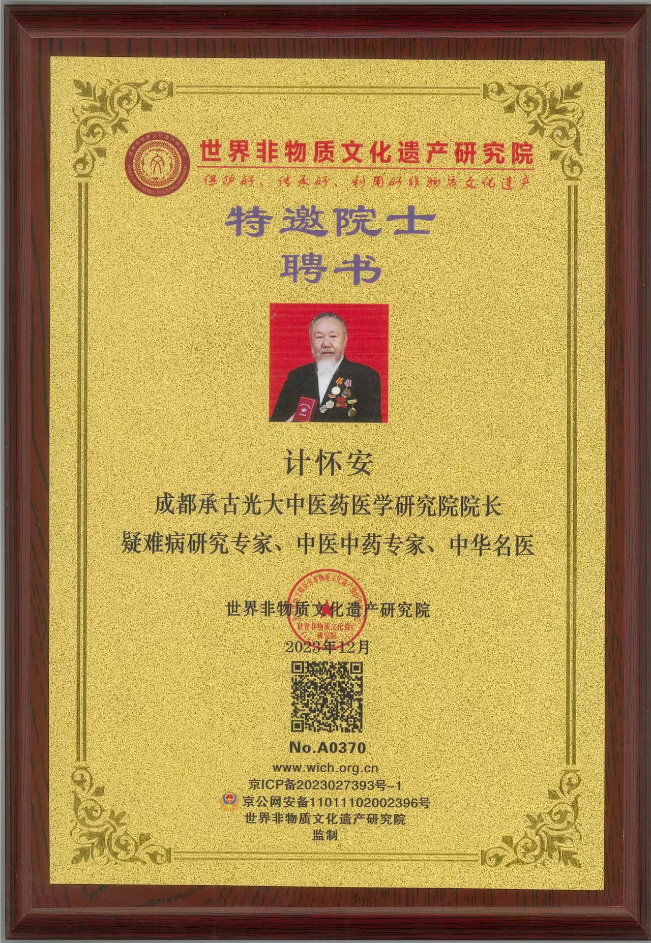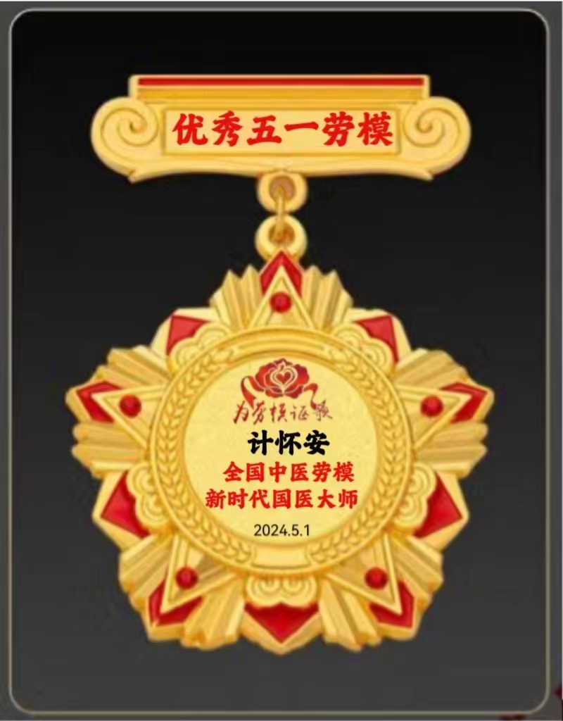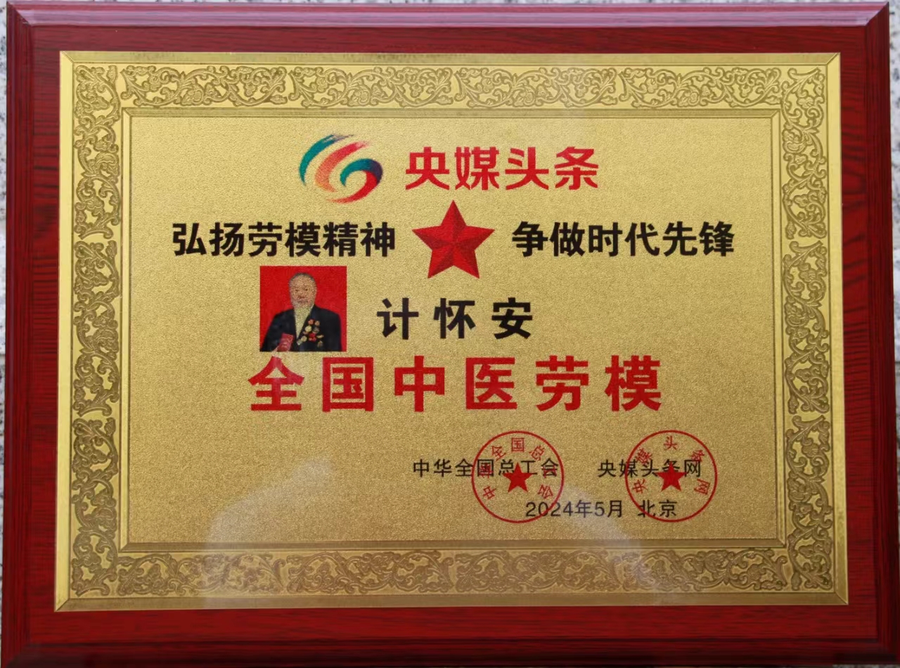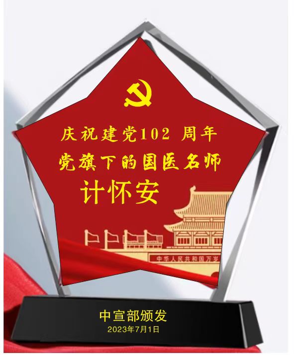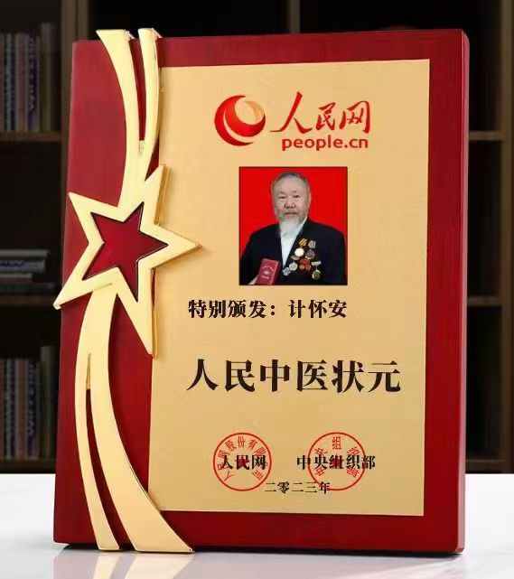 同年同月中宣组织卫生部授予:计怀安国际健康总临中医荣誉院士,题词为:莫道桑榆,为霞尚满天;2023年10月,国家卫健委及国家中医管理局联合颁发全国名医。