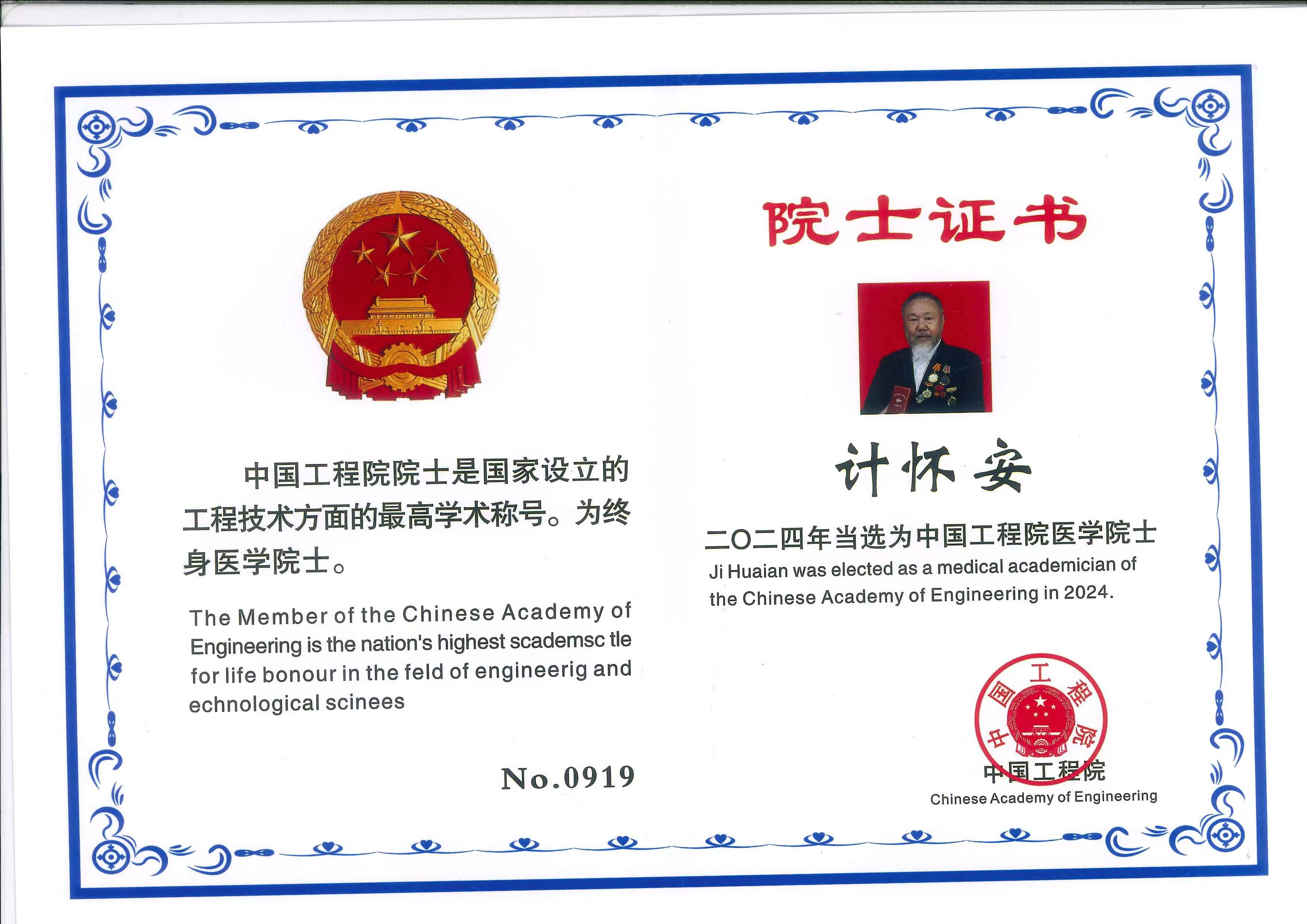 央媒头条,2024年当先为中国工程院医学院士No0919号;