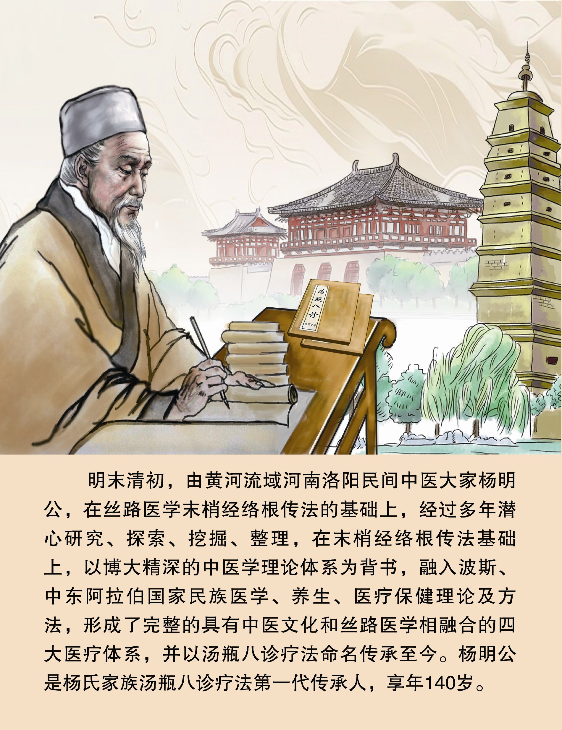 千年传承百年验证的国家级非物质文化遗产汤瓶八诊疗法就是在先贤们不断地总结、交融逐步形成的具有丝绸之路记忆的医学文化传承。明末清初,杨氏祖先杨明公自幼酷爱博大精深的中医学,对伊斯兰医学、波斯医学、阿拉伯医学倾注了精力与心血,予以研究。他将这些丝路医学融入到博大精深的中医学中,形成了最终较为完整的汤瓶八诊医养体系。汤瓶八诊的形成,是根据一千多年来,来自丝绸之路的先贤们所带来的民族医学及传统医学和博大精深的中医学相互交流、融合的见证。 通过在出生于黄河流域河南中医大家的探索、整理、挖掘、实践、验证,世代传承至明末清初的嫡系后裔杨明公。杨明公继承了先祖衣钵,守正创新,不断进取,使汤瓶八诊疗法得以完善。