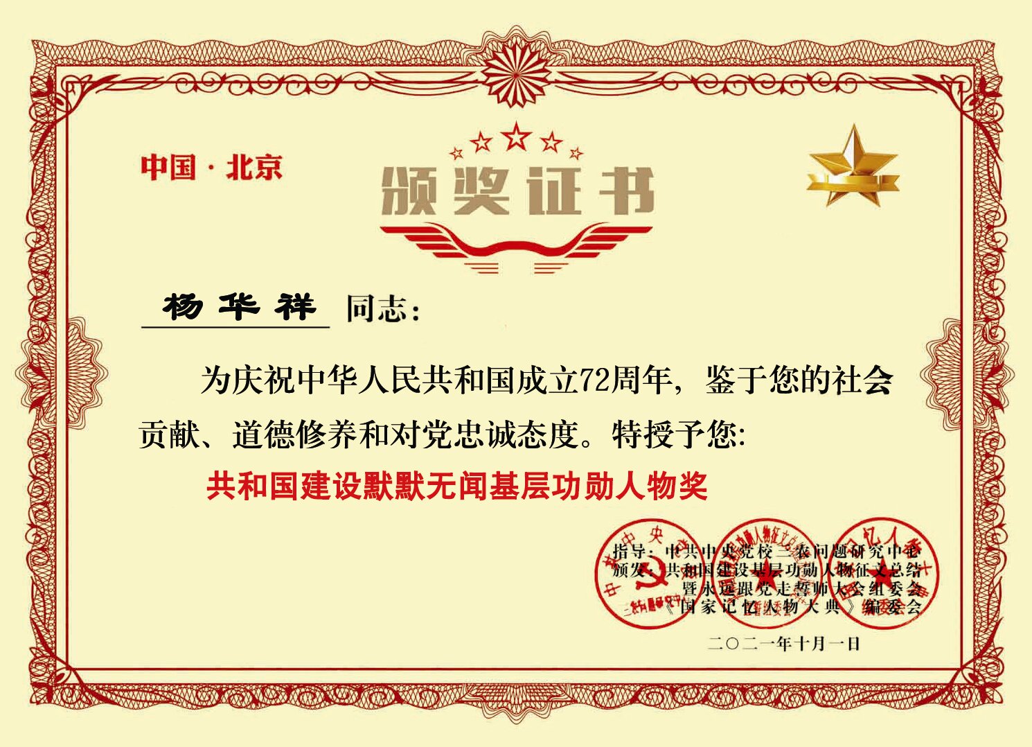 2021年10月1日授予杨华祥共和国建设默默无闻基层功勋人物奖
